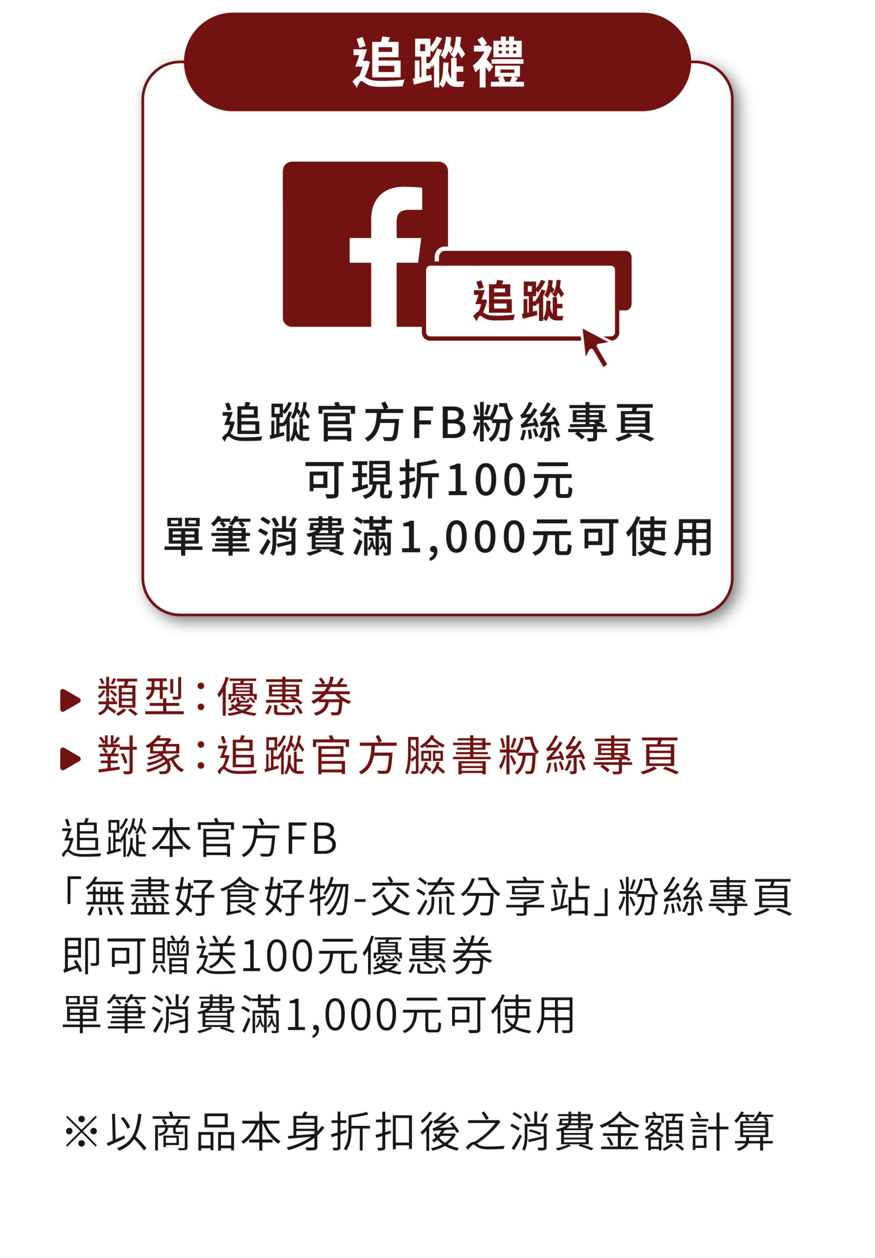 .追蹤禮:追蹤本官方FB粉絲專頁的顧客,需截圖畫面並傳訊息給粉專的服務人員,確認無發放與使用後,服務人員會給顧客優惠券代碼,即可購物時輸入折抵使用,單筆消費滿1000元可折抵100元,使用次數為1次,但「無法與點數」一起使用。