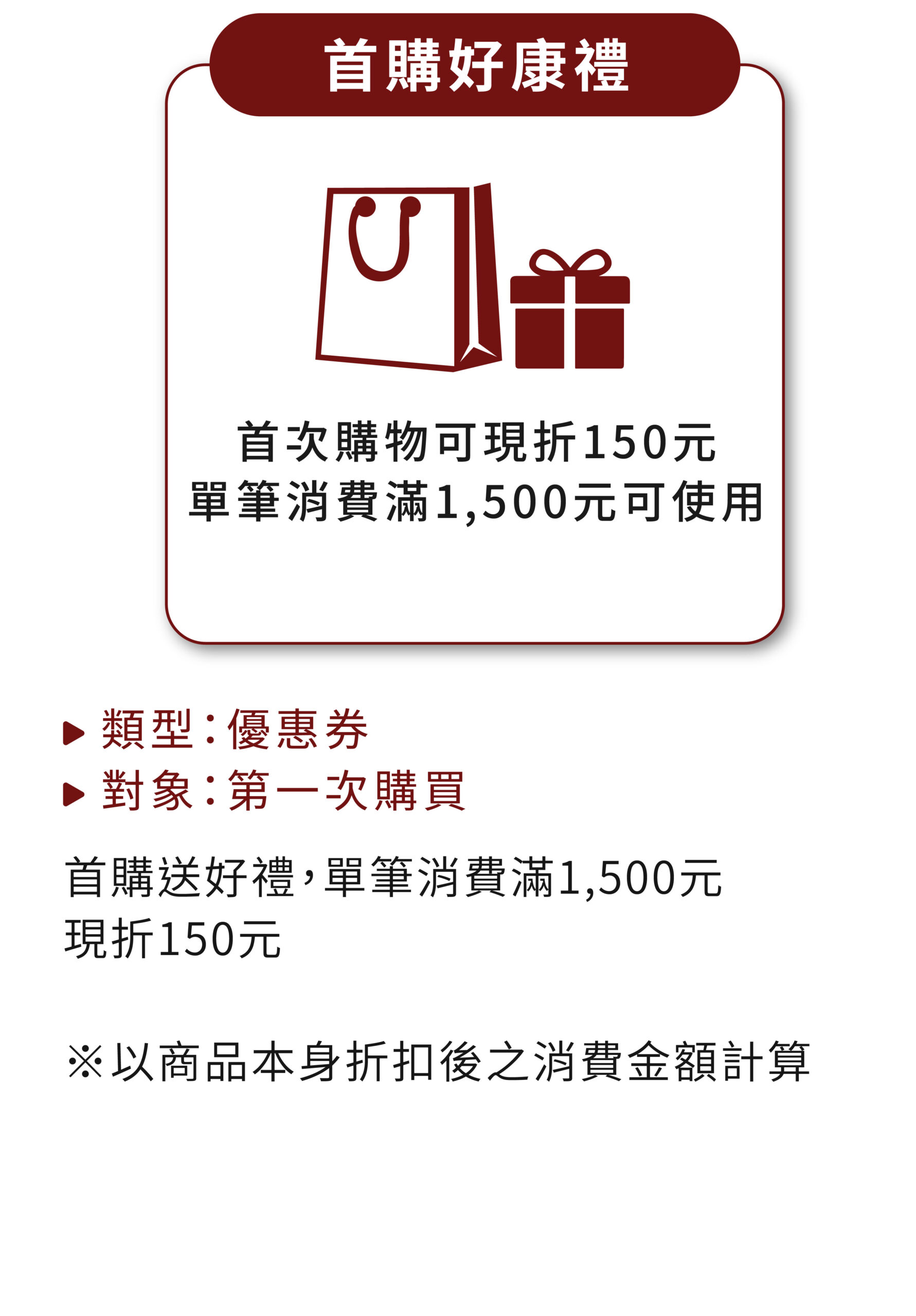.首購禮:指新顧客第一次購物的優惠禮物,單筆消費滿1,500元可現折150元,使用次數為1次,但「無法與點數」一起使用。