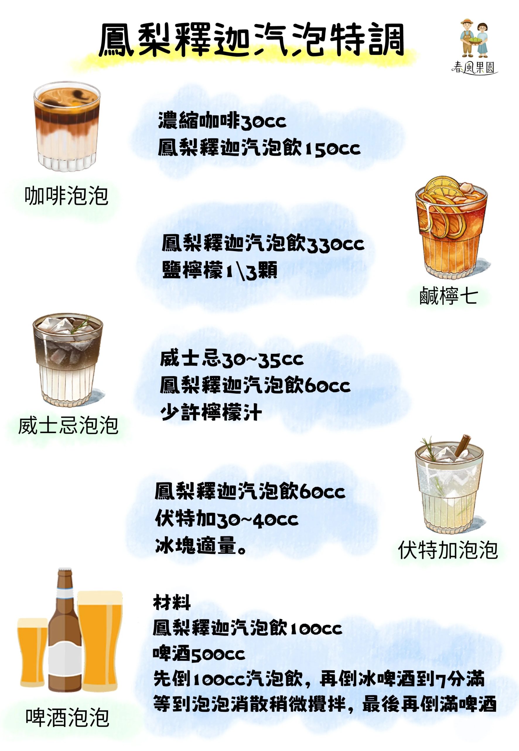 選用台東初鹿的「鳳梨釋迦」-台灣之光,被BBC評選為世界最營養食物第2名。氣泡飲使用完熟採摘的果實,保留鮮果香甜的風味,夏日飲用香甜好喝,從冰箱取出後飲用最過癮。